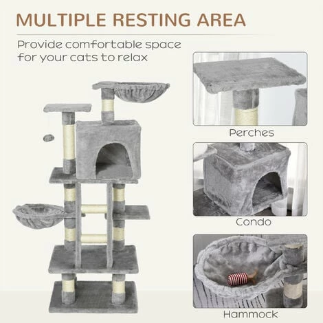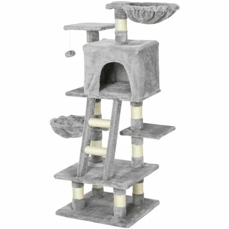Let your cat play the day away with this cat tree for indoor cats from PawHut. A particle board frame for a tough structure, its multi-tier design features a large cat house, ladders, hanging play balls, sleeping baskets and a top perch. It’s covered in soft plush for safety for your cat or kitten, with sisal scratching posts to keep their claws sharp. This cat tree tower is a great piece when your cats are left alone in the house.