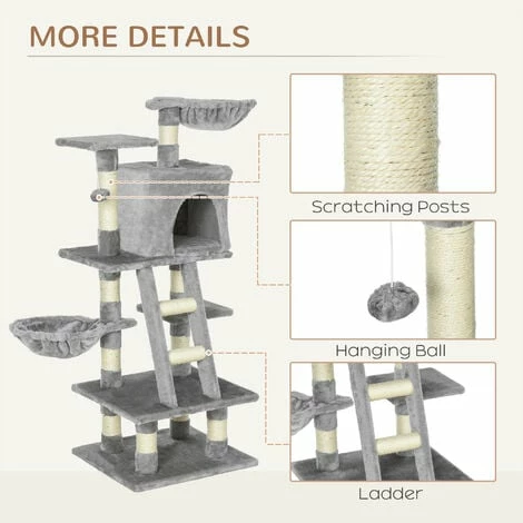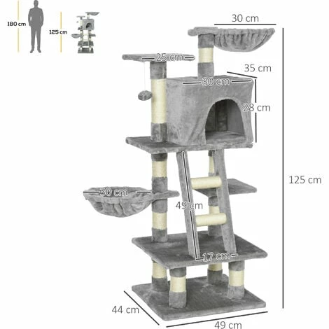• Dimensions: 125H x 49L x 44Wcm. House: 28H x 35L x 30Wcm. House door: 18H x 20Lcm. Sleep baskets: Φ30cm. Ladder: 49H x 17Lcm. Platform from bottom to top: 49L x 44Wcm, 49L x 44Wcm, 25L x 25Wcm, 49L x 35Wcm & 25L x 25Wcm. Pole: Ф6.8cm