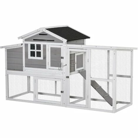 Give your chickens a cozy new home with this PawHut chicken coop. This spacious cage includes the main house and a large run for them to rest and move around with a ramp that connects the room and run. The leading houses are elevated to keep them away from moisture. The tray is removable for easy cleaning. This coop is constructed of fir wood with water-resistant based paint to resist different light outdoor weather. Let PawHut help keep your chickens happy and comfortable.