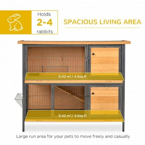 Give your furry friend a comfortable living space from PawHut. This deluxe rabbit house with a unique combination of wood and metal is a perfect mix of safety and freedom for your furry friends and offers all the comforts of home. A cosy, house-style indoor space and spacious front courtyard area offer plenty of room to hoop around. An internal ramp provides quick access between two floors. Lockable doors provide easy access for cleaning and routine tasks. Metal troughs make feeding much easier.