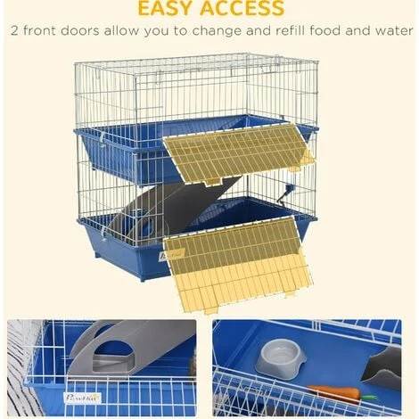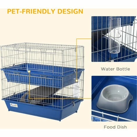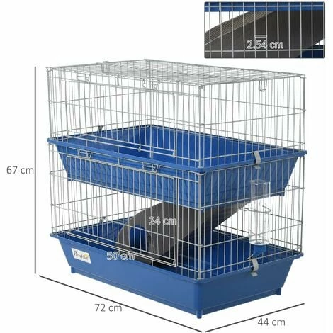 Give your small pet double the space to move around with this two-tier small animal cage from PawHut. Divided by the large ramp, each level features a deep base for keeping bedding and making cleaning easy. Inside features a water bottle and food dish to keep them hydrated and fed, with metal wire fencing to keep them safely inside. The generous bar spacing allows fresh air to pass through, and preventing them from feeling too encaged. A place to keep your pets secure and occupied day and night.