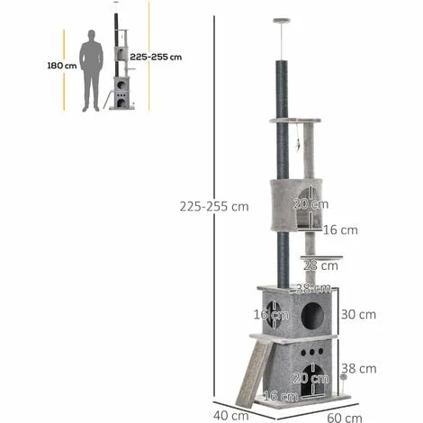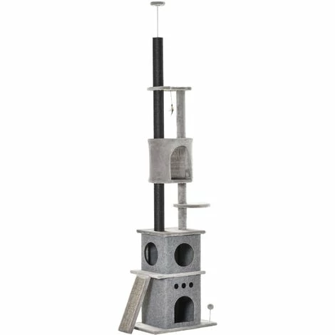 Ceiling to floor fun starts with this cat climbing tower from PawHut. Its multi-tiered design features three large houses, a small ladder for safety, platforms, a play feather, and a ball. The bottom houses feature two cut-out entrances, giving your pet easy access. It also comes with scratching posts so there are plenty of points for them to get their claws short and sharp. Height ranges from 225cm – 255cm, it’s easy to adjust to lock firmly in place – best placed against a wall for stability.