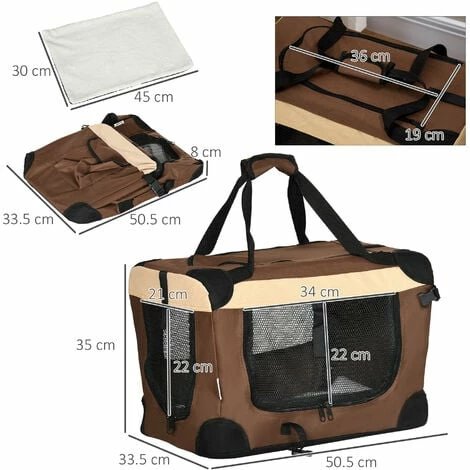 ● Dimensions: 35H x 50.5L 33.5Wcm. Folded: 8H x 50.5L x 33.5Wcm. Front door: 34L x 22Wcm. Left door: 21L x 22Wcm. Top door: 36L x 19Wcm. Cushion: 45L x 30Wcm. Storage pocket: 16L x 16Wcm. Straps: 80cm