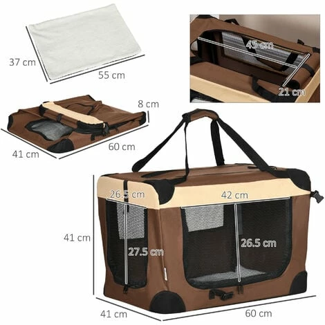● Dimensions: 41H x 60L x 41Wcm. Folded: 8H x 60L x 41Wcm. Front door: 42L x 26.5Wcm. Left door: 26.5L x 27.5Wcm. Top door: 45L x 21Wcm. Cushion: 55L x 37Wcm. Storage pocket: 15L x 16Wcm. Straps: 90cm