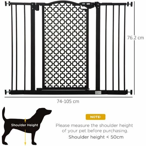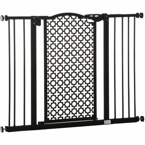 This PawHut pet gate is an efficient way to keep pets in one area, whilst its carved all-black design enhances your home dΓ©cor. The puppy gate is made from solid steel, keeping it durable and strong β it has an adjustable width of 74-105cm, so it’ll fit into different sized spaces with ease. You can simply pass through without your pet escaping, just slide and lift the handle. With a double safety lock at the bottom, it’s a secure way to stop pets from going where they shouldn’t.