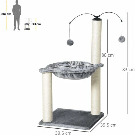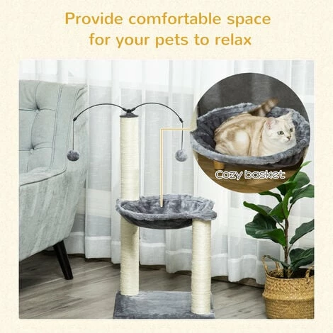 Treat your cat to their own space with this cat scratching tree from PawHut. They’ll be able to get cosy by resting on the hammock, which is covered in soft plush fabric. When they’re feeling playful, they’ll have two hanging toys that’ll grab their attention, whilst the sisal post will satisfy their urges to claw and climb β deterring them from ruining your furniture. This modern cat tree will liven their days, keep them entertained and provide comfort.