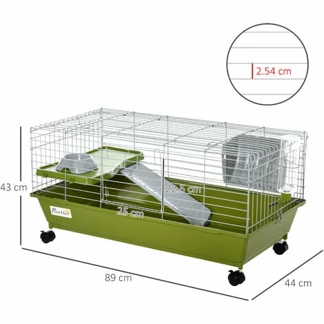 ● Dimensions: 43H x 89L x 44Wcm. Front door: 22.5H x 25Wcm. Top door: 54.5L x 25Wcm. Plastic tray: 14H x 86L x 42Wcm. Platform: 45L x 25Wcm. Ramp: 40L x 13Wcm. Food dish: 4.5H x 13L x 13Wcm. Water bottle: 26H x Φ6cm