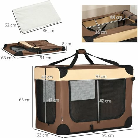 ● Dimensions: 65H x 91L x 63Wcm. Folded: 8H x 91L x 63Wcm. Front door: 70L x 42Wcm. Left door: 46L x 43Wcm. Top door: 64L x 35Wcm. Cushion: 86L x 62Wcm. Storage pocket: 25L x 28Wcm. Straps: 125cm