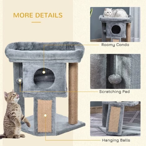 With this PawHut small cat tree, your pet’s daily life won’t be the same. If they want to scratch, climb and play, they can happily do so, thanks to the multiple levels, jute scratching pad and toy ball, which will stop them from climbing and clawing at your furniture. When it’s time to rest, they have two options โ a top perch, or a private cat house โ both are covered in soft plush fabric for extra snugness. With this cat tree tower, every day is a comfortable one.