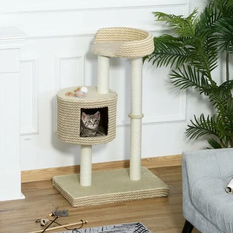 Keep them happy and active with this PawHut cat tree. This cat tree for indoor cats features jute rope wrapped scratching posts, a soft-lined house and perch platforms. The scratching posts allow your pet to keep their claws sharp, also safely stop them from wanting to use your furniture. The cat climbing tower provides a place for them to rest, play and exercise all day and night long.