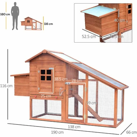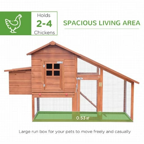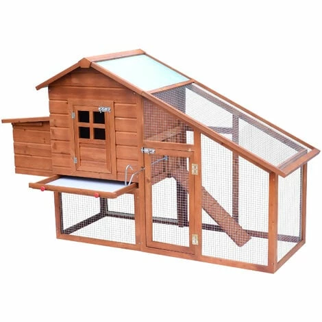 Give your furry or feathered friends a comfortable living space from PawHut! Cozy indoor space and the spacious run area offer ample space for your pet. Lockable doors and the slide-out tray provide easy access for cleaning, feeding. A solid fir wood frame with water-resistant paint and tilt roof makes this cage suitable for use outdoor. The nesting box roof can be opened for you to extract eggs. With this cozy yet spacious chicken hutch, your animals will get so much comfort.