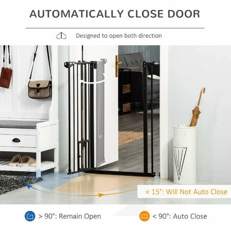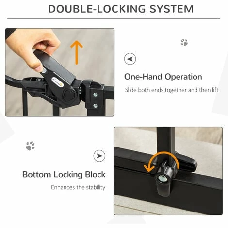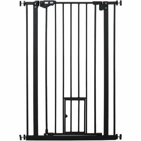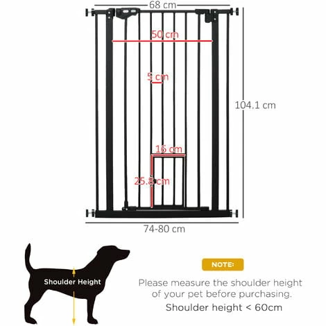 Keep pets away from rooms when required with this PawHut pet stair gate. Made from sprayed metal with lead-free treated surface for strength and safety. 74cm to 80cm wide, allows to fit into different sized spaces with ease while 104.1cm high – the extra tall gate makes it difficult for pets to get over. Slide and lift, the handle is easy to open, allowing you to pass through quickly without your pet escaping for security. Cat door provides a secure separation between cats and dogs.