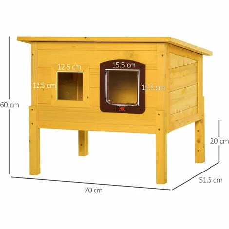 This PawHut cat house is a great outdoor home for stray cats. When the cats are outdoors, this is a secure shelter for them to hide in. It can also be a cool place for them to relax in when it gets hot under the sun. Made from Fir wood and sitting well above the ground it is ideal to keep unwanted animals away. The roof of outside cat house is not permanently attached making it easier for owners to open and clean the house or an easy access to place kittens in or out.