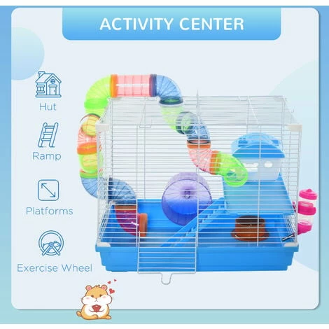 • Features a water bottle, food dish and exercise wheel, keeping them active, fed and hydrated