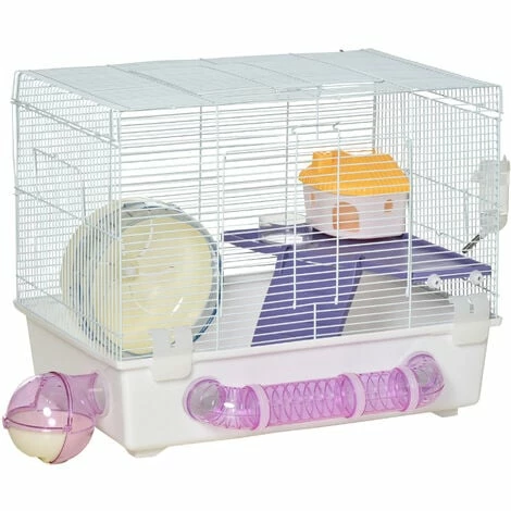 This PawHut hamster cage is the ultimate playground for your small pets to have. Made with steel wire with a top opening and a front door, this allows for air circulation and is easily accessible to your pets. Includes a hut on the perch, water bottle, food dish, ramp, shower room and exercise wheel, this hamster house with tube tunnel provides ample living and activity space. The whole unit sits above the floor and is an overall great home for your pets.