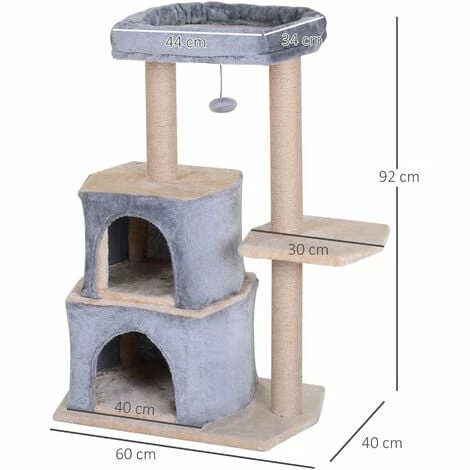 • Multi activity design featuring two hide-away cat houses, a top resting pads, a middle platform and a hanging play ball
