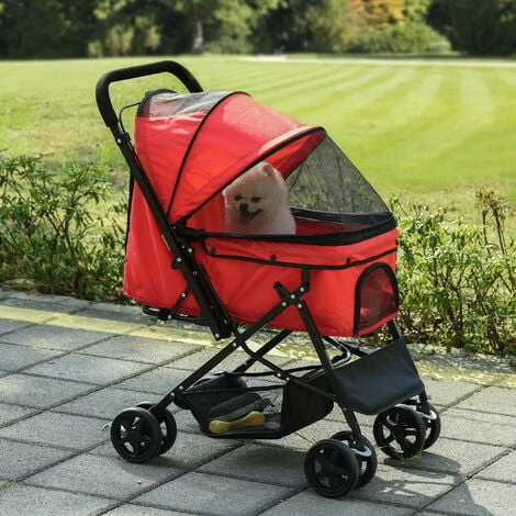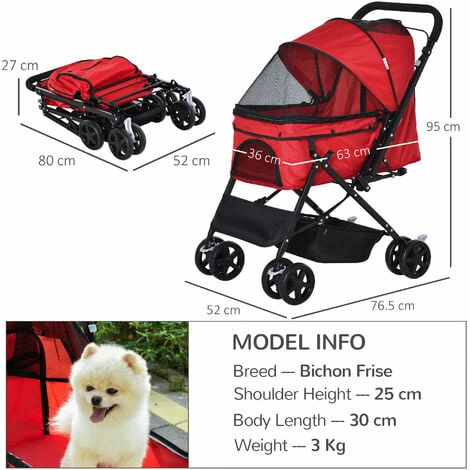 Take the dog outdoors with you safely thanks to this pet stroller from PawHut. It comes with smooth-rolling wheels and a handle, making it easy to take with you on the road. The top basket is spacious so they get plenty of room inside, protected with a mesh window to allow air in and out and a three-level adjustable canopy to shield them from above. It comes with a bottom basket and zipped pouch for easy storage on-the-go, finished with a reversible handlebar so you can push this piece either facing your pet or looking away from it. Suitable for small dogs such as Bichon Frise and Pug.