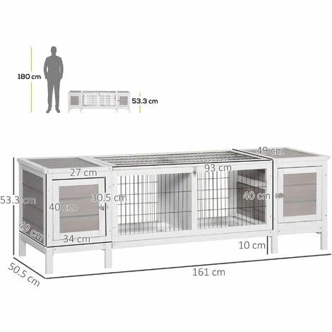 ● Dimensions: 53.3H x 161L x 50.5Wcm. Living house: 40H x 34L x 49Wcm. Door: 30.5H z 27Lcm. Middle run box: 18.5H x 20Wcm. Tray: 93L x 47Wcm