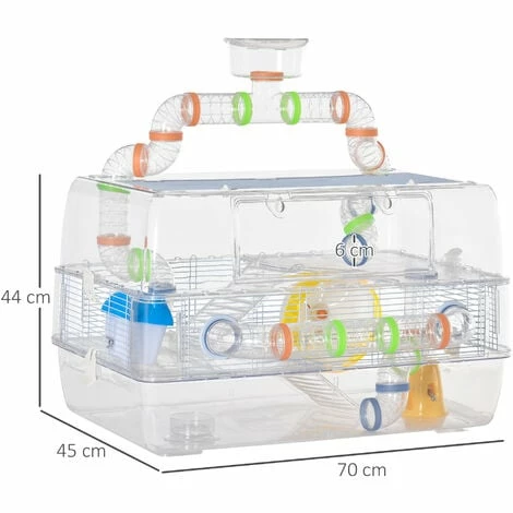 ● Internal accessories dimension: platform dimension: 43L x 30W cm, small room dimension: 12L x 7W x 16H cm, ladder dimension: 23L x 11.5W cm, platform height: 12.5 cm, 25.5 cm, exercise wheel dimension: Φ19 x 8H cm, straight tube dimension: Φ6 mm, short bent tube dimension: Φ6 mm, long bent tube dimension: Φ6 mm