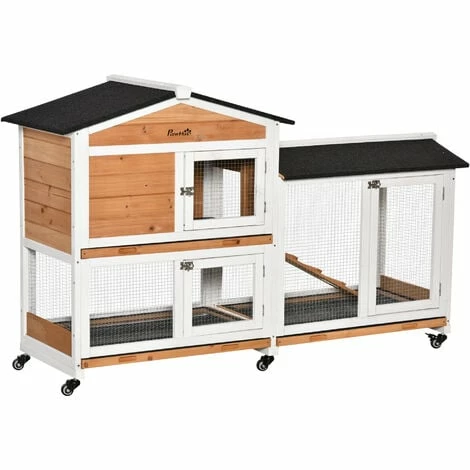 The perfect home for rabbits and other small pets – this spacious rabbit cage from PawHut consists of two floors with a large house and a guinea pig run – they’ll roam easily using the ramp. Made from solid fir wood, the indoor guinea pig cage is covered in water-resistant paint for protection against wet weather, whilst the tilted asphalt roof ensures the area is dry. Watch your pets in their new environment through the mesh wire, which keeps the area ventilated.