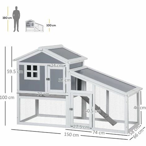 ● Dimensions: 100H x 150L x 66Wcm. House: 59.5H x 70L x 58Wcm. Main house door: 32H x 24Lcm. Side run box door: 40.5H x 27.5Lcm. Run box under the main house: 36.5H x 70L x 58Wcm. Side run box: 72.5H x 74L x 58Wcm. Ramp: 15L x 59.7Wcm