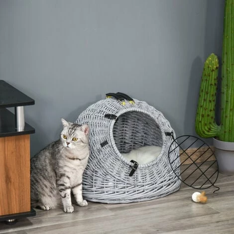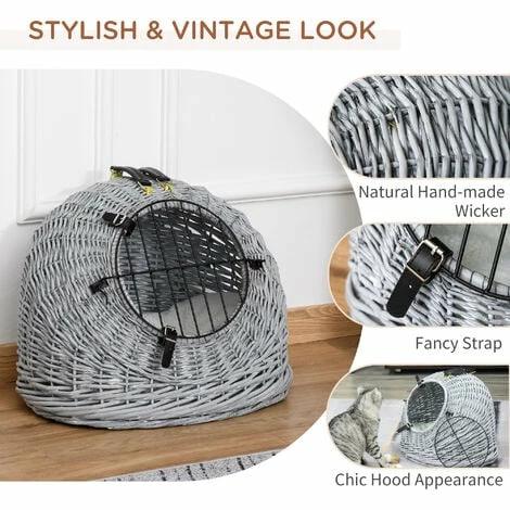 Give your cat the luxurious option when taking them travelling with this basket from PawHut. Mid-grey in colour, the body is made using hand-woven and non-toxic wicker in a spacious semi-round shape, providing a safe shelter for you cat for many years to come, as well as being safe to your pet if they catch their claws. Placed towards the top, a metal wire gate with a buckle fastening keeps your cat/kitten safely and securely in, with a removable fleece-feel cushion for comfort.